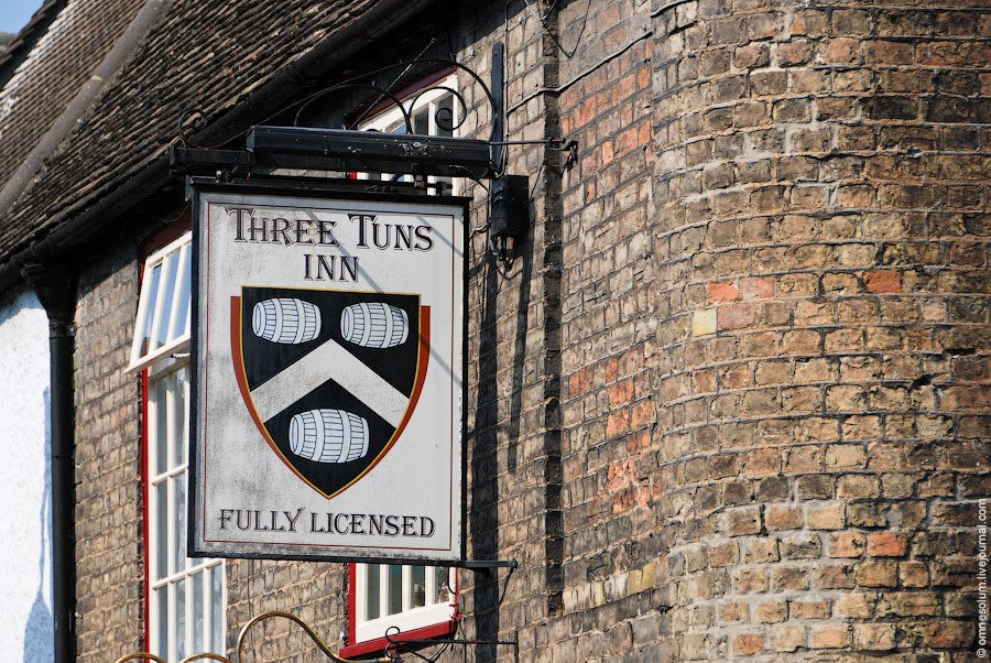 Неодушевлённые предметы тоже часто присутствуют на вывесках. Три бочки, например, отсылают к гильдии виноделов или пивоваров. На фото: Three Tuns Inn, Хантингдон: