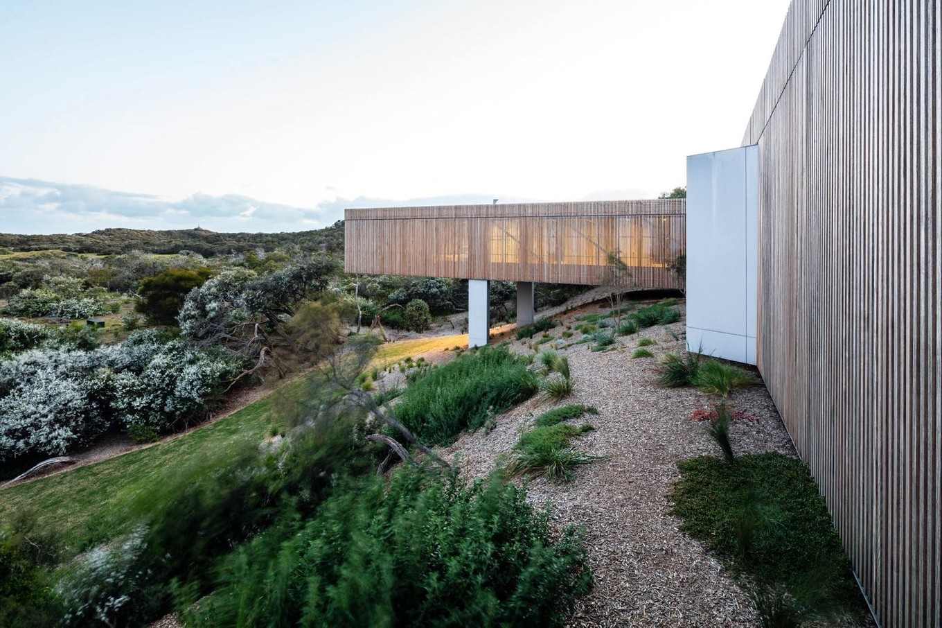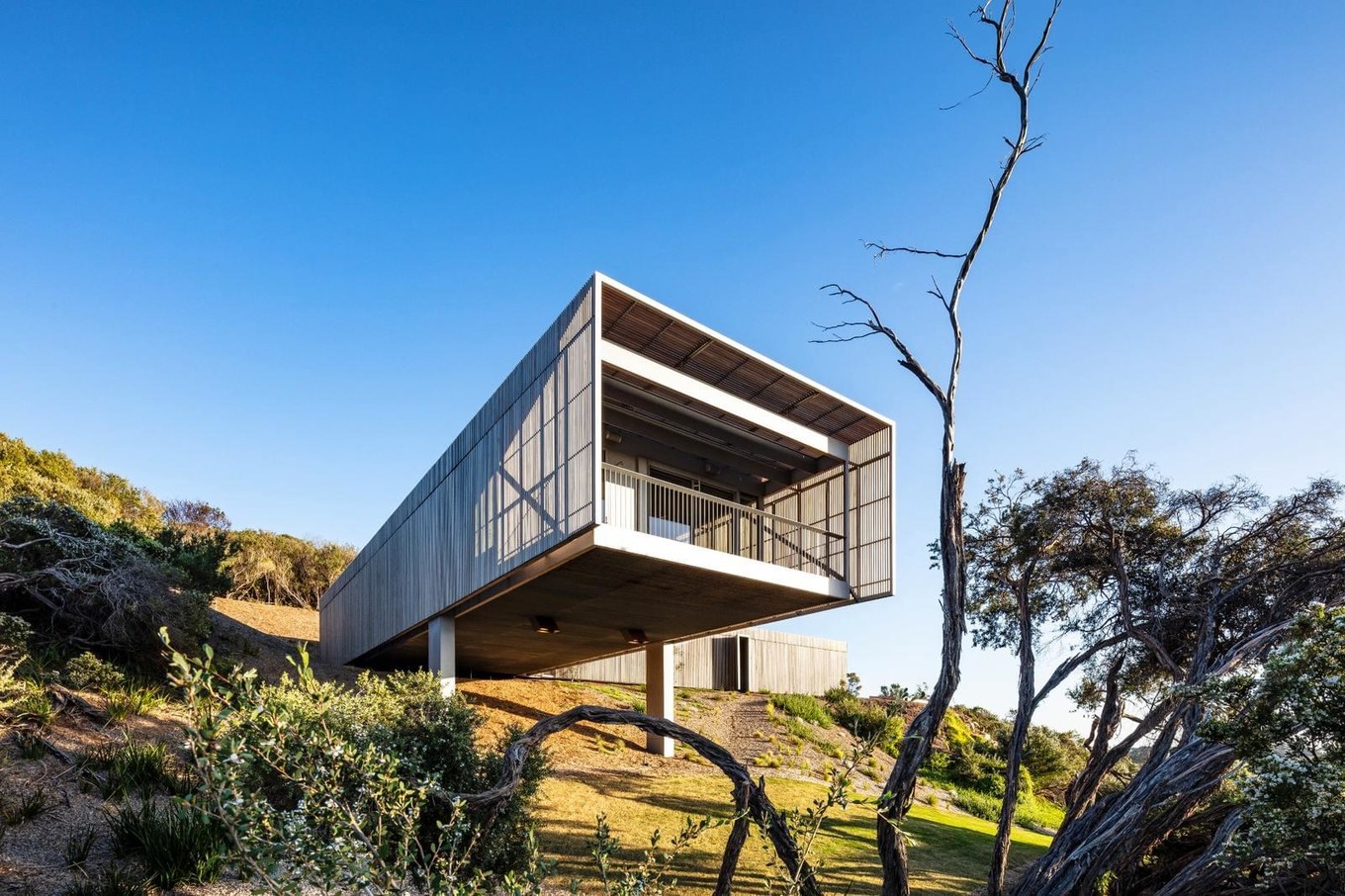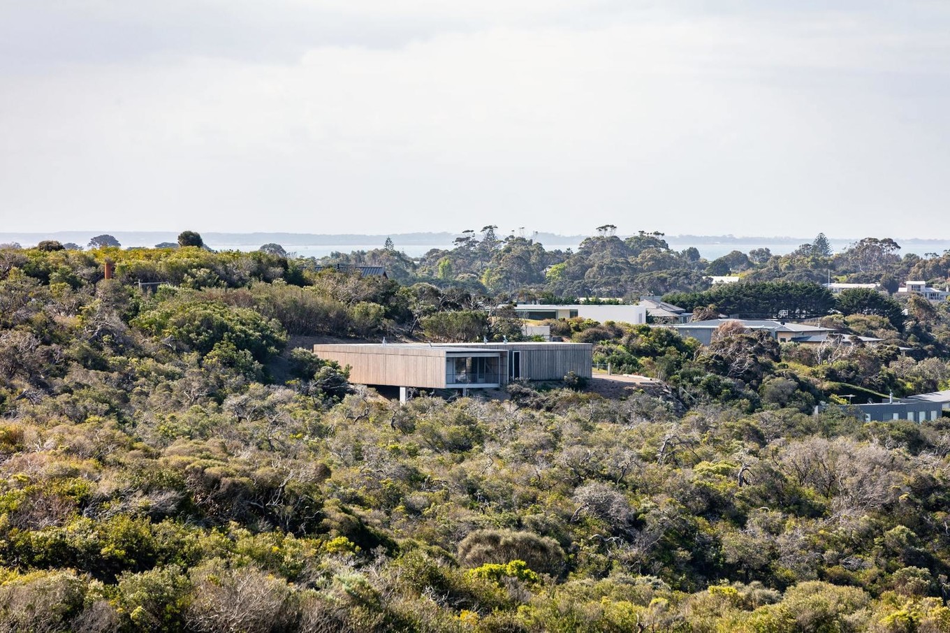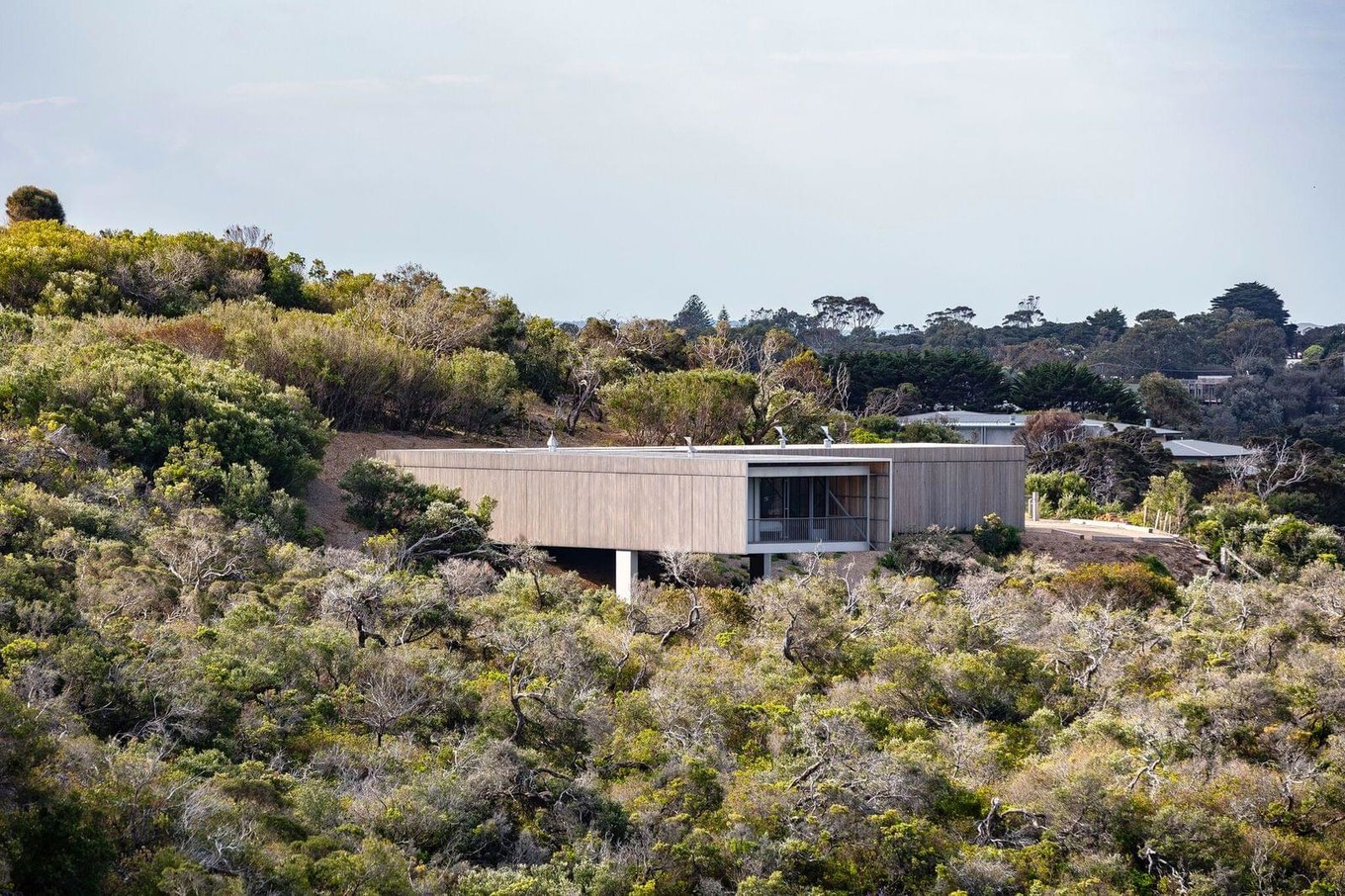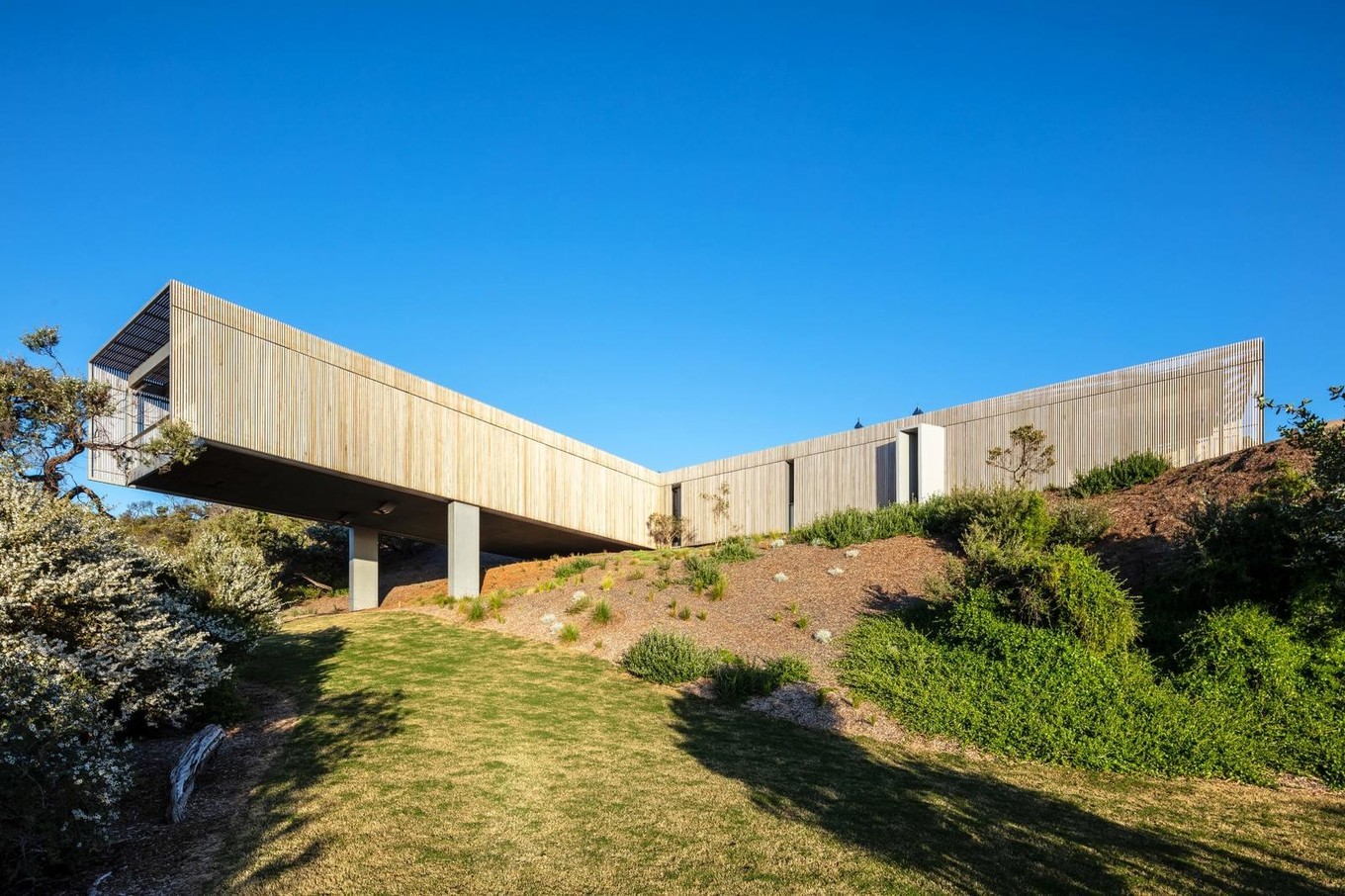 Среди крутых песчаных дюн на побережье полуострова Морнингтон в Австралии построили Г-образное здание, которое так гармонично вписалось в участок с изогнутым кустарником, будто было там всегда. Для внешней отделки фасада архитекторы выбрали деревянную облицовку, которая со временем будет соответствовать серому оттенку прибрежных чайных деревьев.