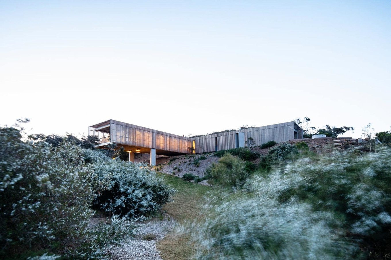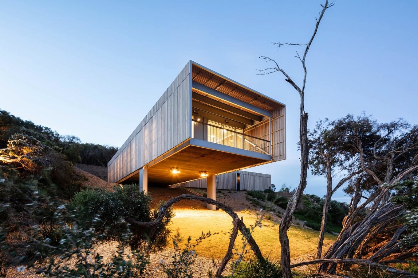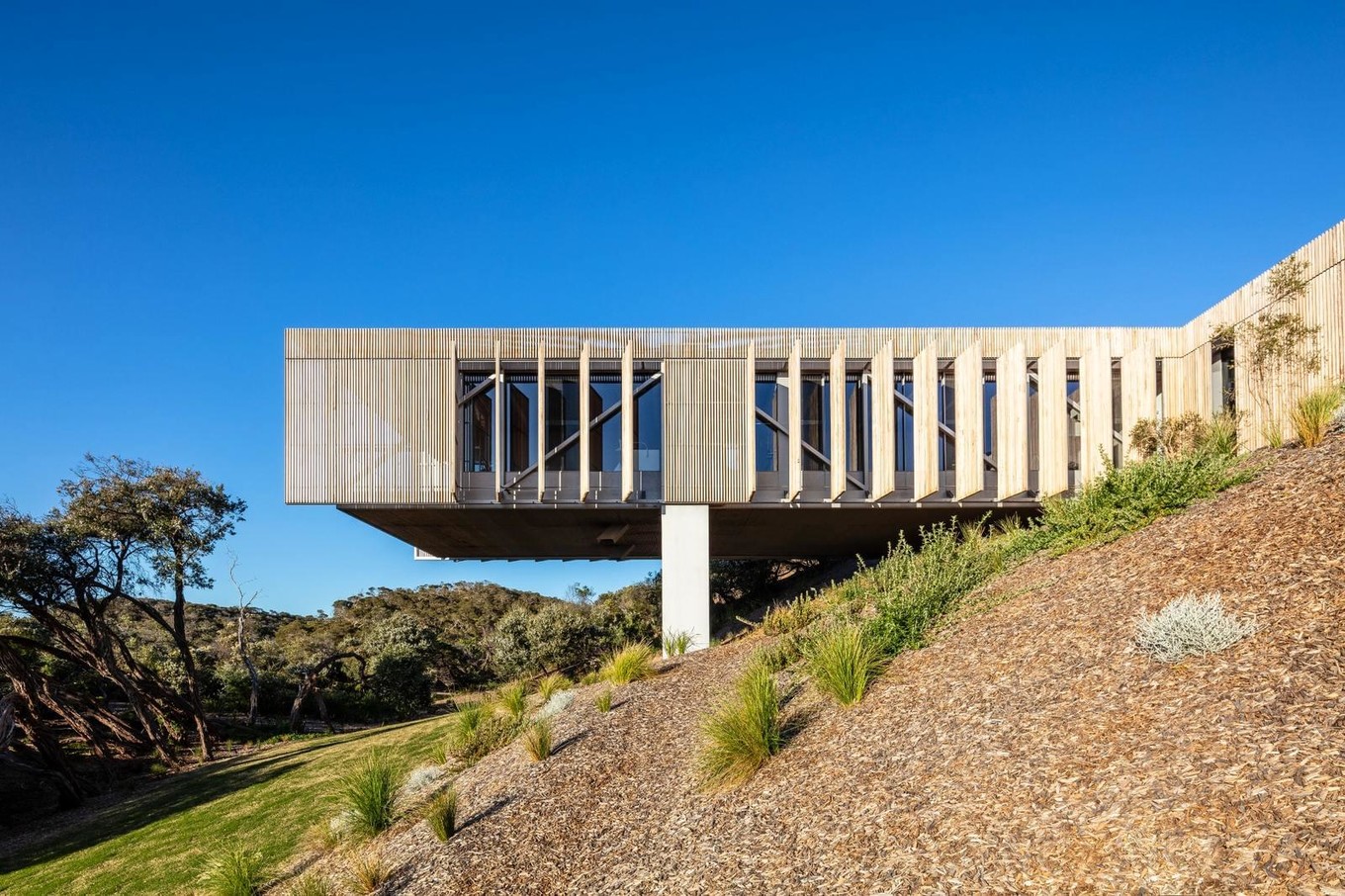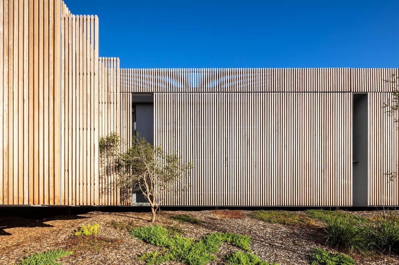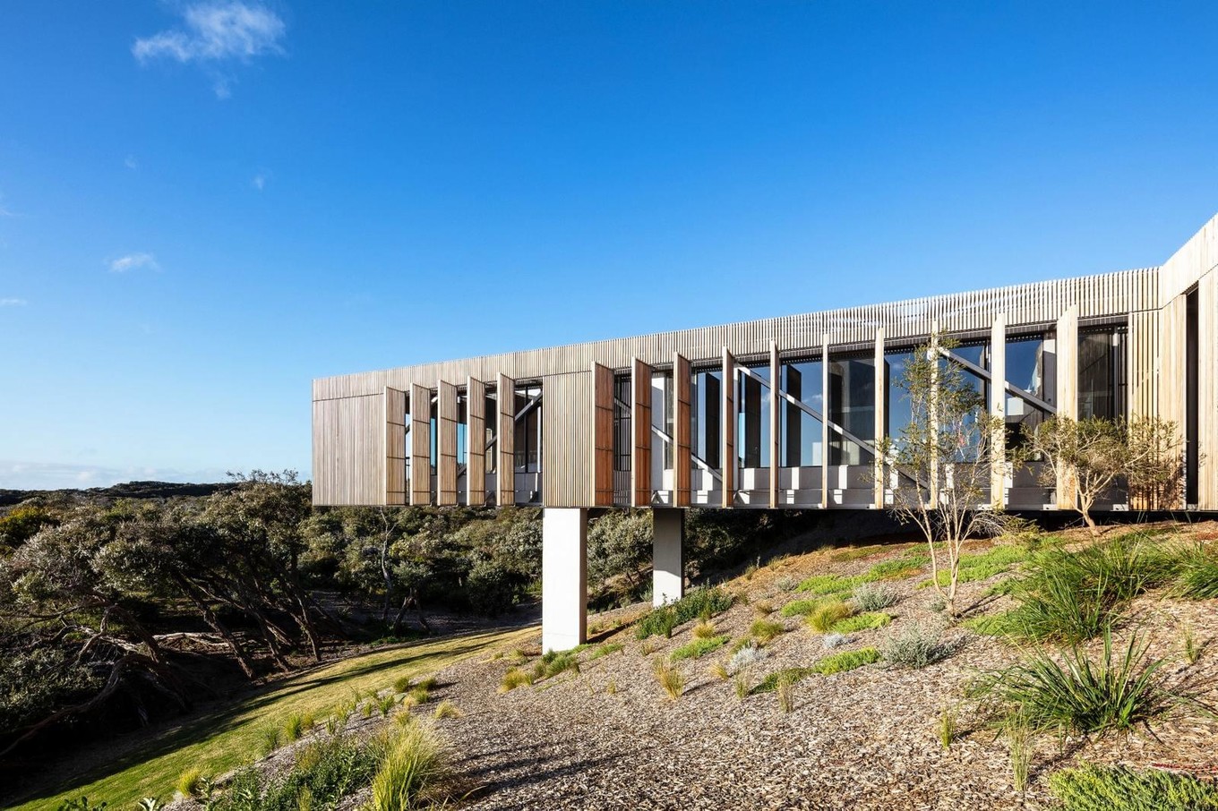 Среди крутых песчаных дюн на побережье полуострова Морнингтон в Австралии построили Г-образное здание, которое так гармонично вписалось в участок с изогнутым кустарником, будто было там всегда. Для внешней отделки фасада архитекторы выбрали деревянную облицовку, которая со временем будет соответствовать серому оттенку прибрежных чайных деревьев.