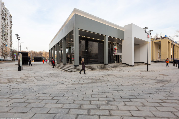 Начнем со станции «Лефортово». Наземный вестибюль прекрасно вписался рядом с кинотеатром Спутник.