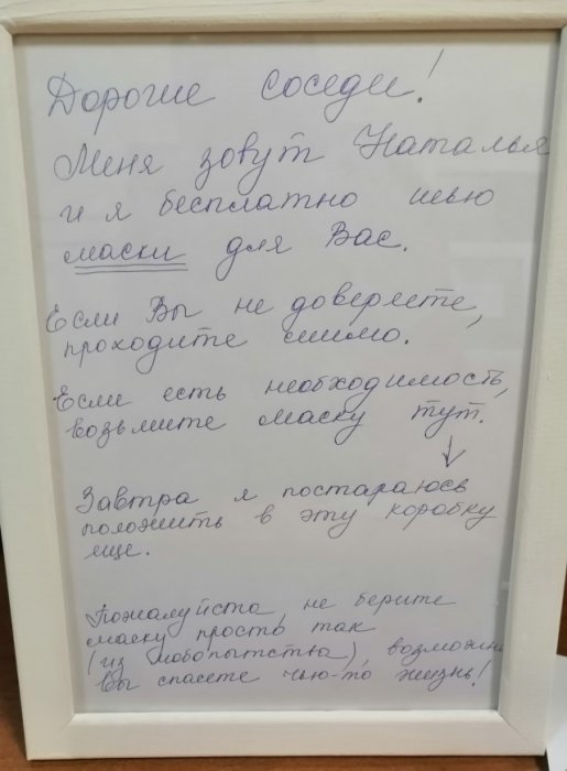 Взаимопомощь в нынешних условиях 05/04/2020 00:36 Неравнодушная соседка по по подъезду Наталья оставила на первом этаже лоток с руколепными масками. Вечером того же дня соседи оставили благодарности и пожелания. Главная / Картинки +1 Admin 0 388