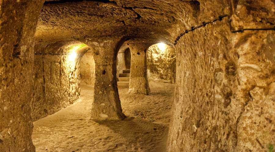 На территории Каппадокии разбросано несколько мелких подземных селений, но Деринкую значительно выделяется среди всех остальных. Археологи датируют этот лабиринтообразный комплекс VIII веком до Рождества Христова. Под землей Деринкую уходит вниз на целых 18 уровней. В таком убежище беглецам нечего было опасаться долгой осады — совершенно самодостаточный мегаполис мог существовать и без поставок с поверхности. Удивительно, но огромное сооружение было найдено лишь в 1960, притом совершенно случайно.