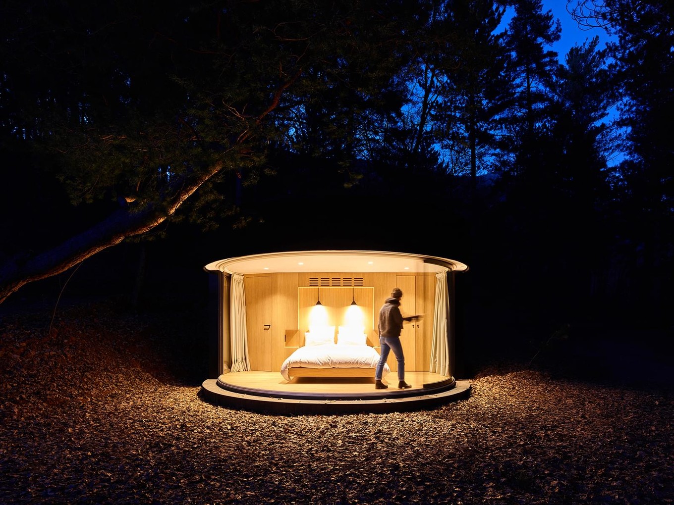 На площади всего 18 квадратных метров представлены спальня, душевая, туалет и гардероб. Главным элементом объекта является окно LUMICENE® с изогнутым стеклом и алюминиевой рамой, скользящим между двумя направляющими, позволяя внутреннему пространству плавно трансформироваться в зону отдыха на открытом воздухе. В закрытом состоянии LumiPod — это удобный и защищённый кокон, полностью погруженный в природу.
