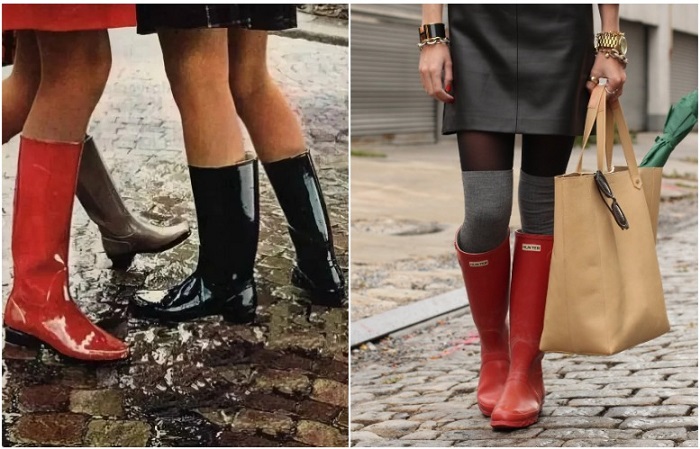 Наверняка, у каждой советской женщины в гардеробе присутствовала эта практичная и неубиваемая обувь. Учитывая, что с дорогами на тот момент было туго, и чтобы добраться до работы или магазина приходилось преодолевать семь кругов «грязевого ада», резиновые сапоги очень сильно выручали. Кто бы мог подумать, что современные дизайнеры вспомнят об этой обуви на волне интереса к удобным и практичным вещам. Однако, факт остается фактом. Многие американские и европейские бренды предлагают девушкам широкий ассортимент интересных моделей из качественных материалов. Так, Burberry выпустили резиновую версию черных сапог, которые издали практически невозможно отличить от экземпляров из матовой кожи. Mulberry предложили клиенткам красную модель с байкерскими пряжками и ремешками, которая визуальна похожа на обувь Кота в сапогах. А бразильский бренд Melissa, который славится своими резиновыми балетками, пошел еще дальше и создал сапоги-трансформеры color block – высокое голенище отстегиваются и получаются челси с вытянутым носком до середины щиколотки. Как видите, выбрать есть из чего.