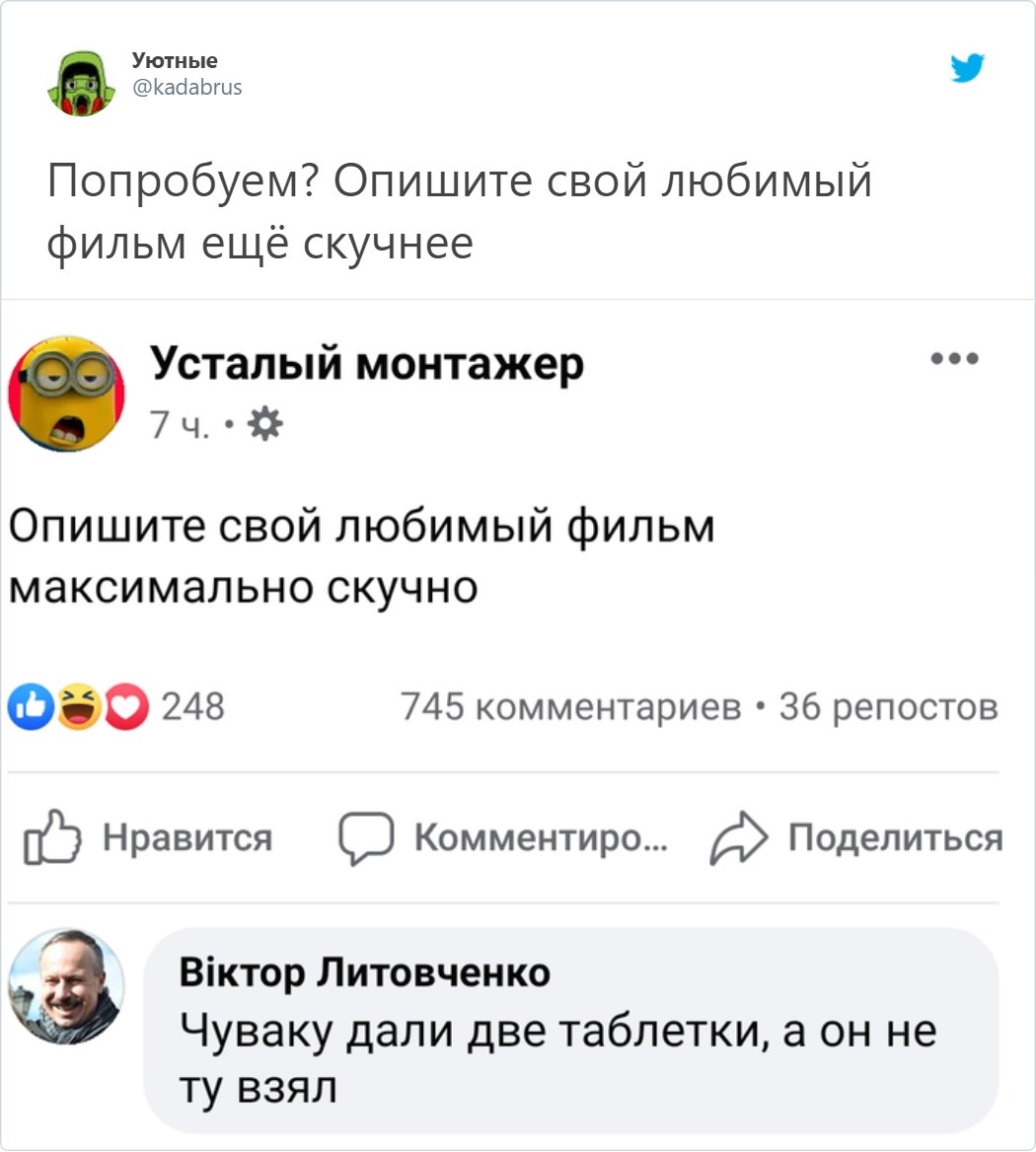 Главная страница » Главная » Картинки » "Мужику дали две таблетки, а он принял не ту": опиши любимый фильм максимально скучно