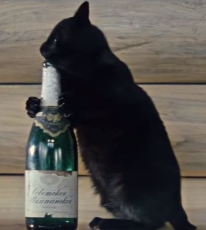 В этом же эпизоде есть момент, когда черный кот пытается пить шампанское из бутылки. Гайдай не зря позаботился о том, чтобы этикетка «Советского» в кадре была развернута к зрителю и чтобы кот не закрывал ее собой.