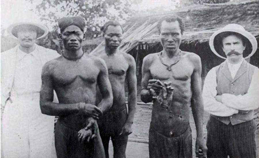 10. Присмотревшись, можно заметить, что перед этим задумчивым африканцем лежат отрубленные детские стопа и кисть. Фото сделано в 1904 году.