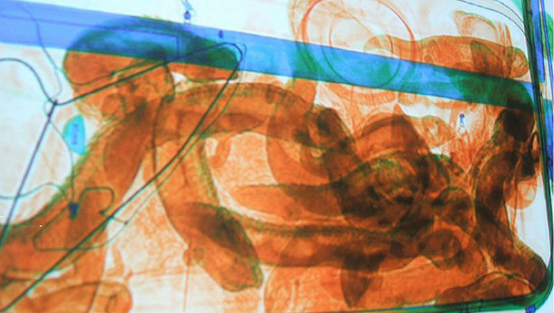 А этот «груз» еще не успели конфисковать … На данном снимке, полученном при сканировании и предоставленном СМИ бразильской федеральной полицией, можно видеть пакетики с кокаином в желудочно-кишечном тракте 20-летнего гражданина Ирландии, который был арестован бразильской полицией в аэропорту Конгоньяс в Сан-Паулу. Молодого человека, имя которого пока не разглашается, остановили при попытке подняться на борт самолета, направляющегося в Брюссель. В кишечнике арестованного находилось 72 пакетика, в которых был почти килограмм кокаина.