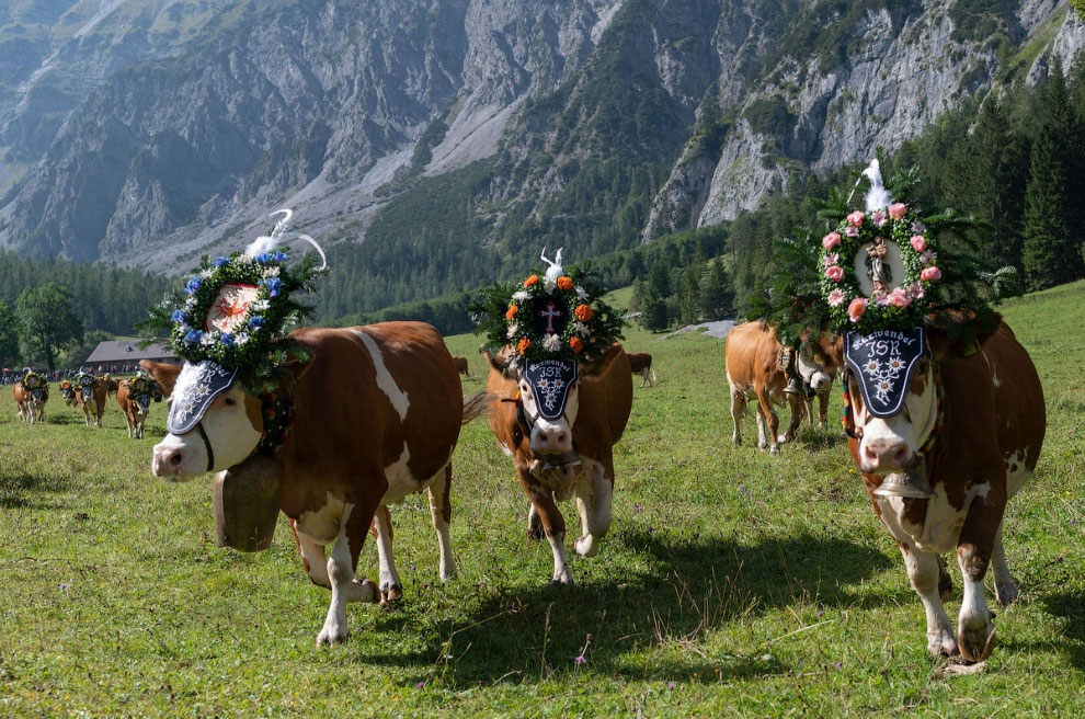 Коровы, украшенные колокольчиками и цветами, покидают свои летние пастбища в альпийском природном парке Карвендель, Австрия. (Фото Joe Klamar):