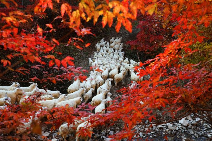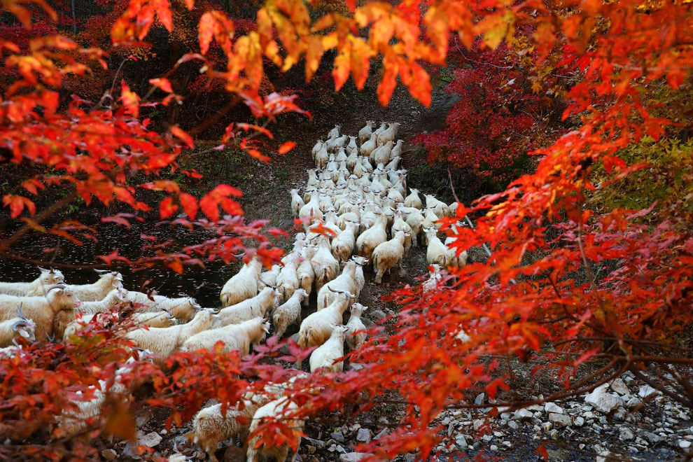Овцы и осенние деревья в Даньдуне, Китай, (Фото Sun Chengwu):