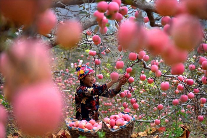 Сбор урожая яблок в уезде Юань, провинция Шаньдун, Китай. (Фото Zhao Dongshan):