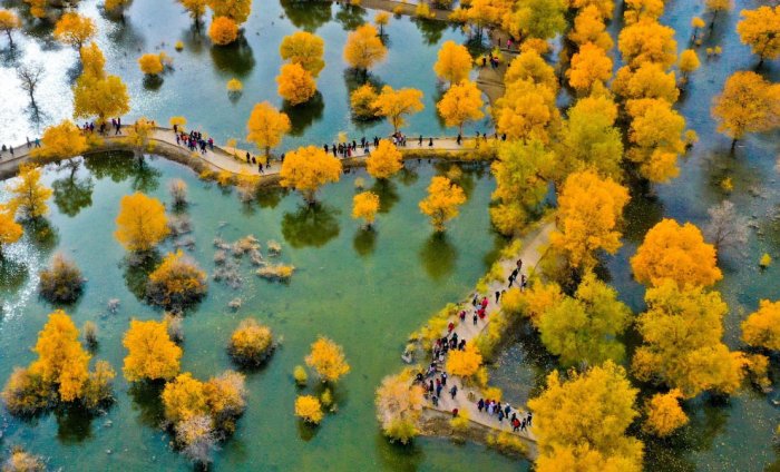 Туристы в городе Цзюцюань, Китай, 7 октября 2020 . (Фото Barcroft Media):