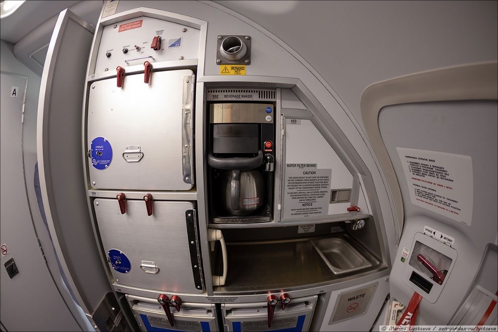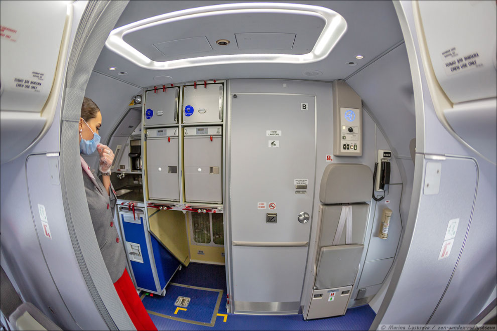 Кухня в обеих частях салона пока не используется — на некоторое время в связи с пандемией на рейсах не предлагают бортпитание и горячие напитки. Воду пассажир может попросить в индивидуальном порядке.