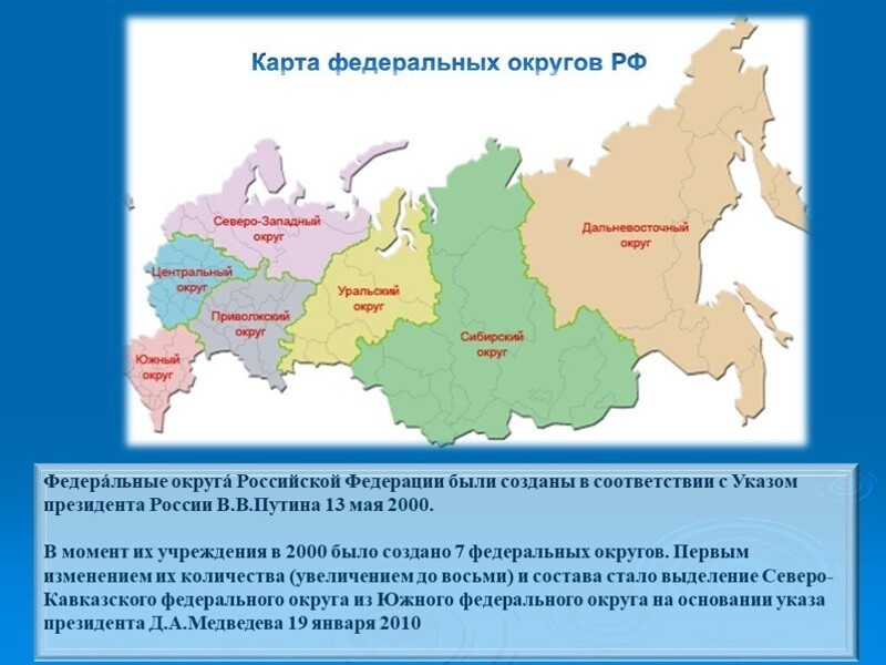 В России созданы федеральные округа и институт полномочных представителей Президента РФ в них. В момент их учреждения было создано 7 федеральных округов — Центральный, Северо-Западный, Южный, Приволжский, Уральский, Сибирский и Дальневосточный.