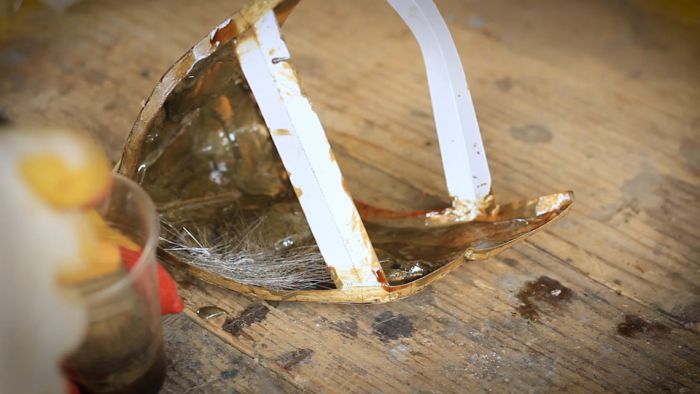 Когда смола высохла, продолжил укреплять эпоксидкой и стекломатом. По такому принципу ещё частенько делают бамперы на авто. Дело не хитрое, просто отрывал куски стекломата, прикладывал с обратной стороны и пропитывал эпоксидной смолой. Для маски 2-3 слоя за глаза. Последним слоем проложил очень тонкую стеклоткань что бы придавить ворс от стекломата.