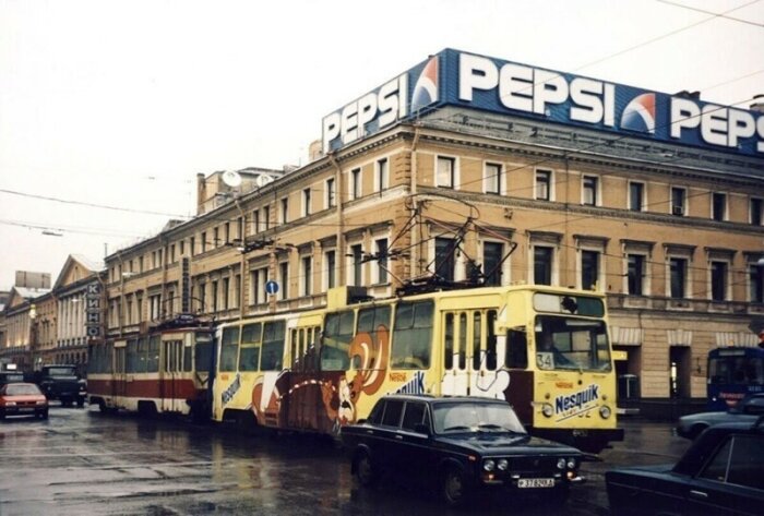 Если в 1992 году в городе только-только появлялась наружная реклама, то в 1993 ее стало ну очень много. На углу Садовой и Невского смонтировали огромную рекламу «Пепси», которую провисела здесь довольно долго.