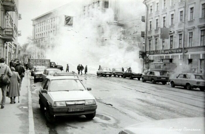 В Петербурге из танков никто не палил, а вот теплотрассы прорывало тогда вполне регулярно. В этот раз это случилось на углу Вознесенского проспекта и Садовой улицы.