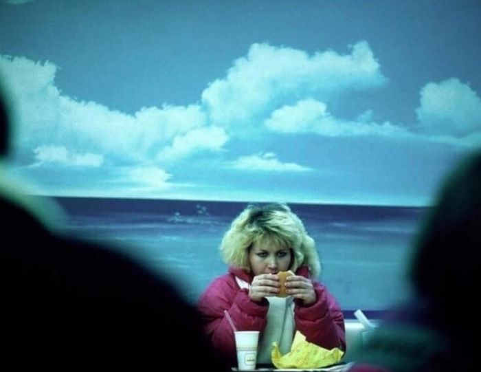 Девушка впервые пробует еду из "Макдональдса". Москва, 1993 год