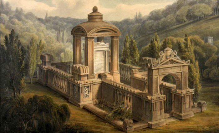 В 1815 году, когда его супруга Элиза умерла, он построил над ее могилой роскошное надгробие. Памятник имел четырехугольную форму, увенчанную куполом, и был украшен орнаментом, разработанным самим сэром Скоттом. На крыше вдовец разместил сосновую шишку – символ регенерации в древнем Египте. Вершину надгробия опоясывала гирлянда из лавровых листьев – символы вечности.