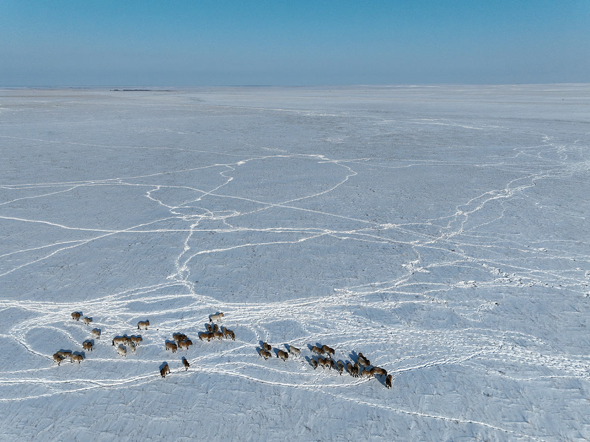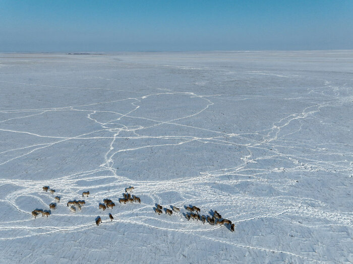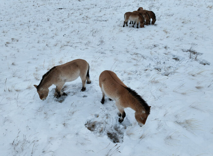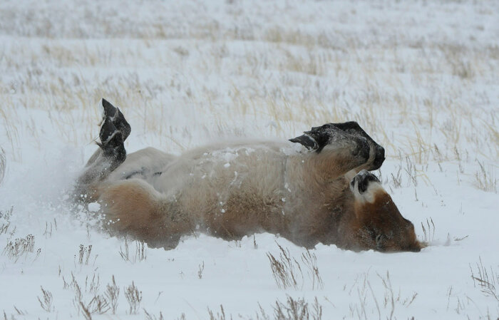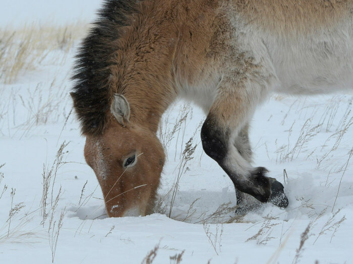 Шерсть зимней шубы у них толщиной до пяти сантиметров и она настолько густая и плотная, что не пропускает тепло тела наружу, не промокает от снега. Кормов в травянистой степи тоже хватает. Лошади тебенюют, то есть раскапывают снег передними копытами. Вот несколько снимков, показывающих, как они это делают.