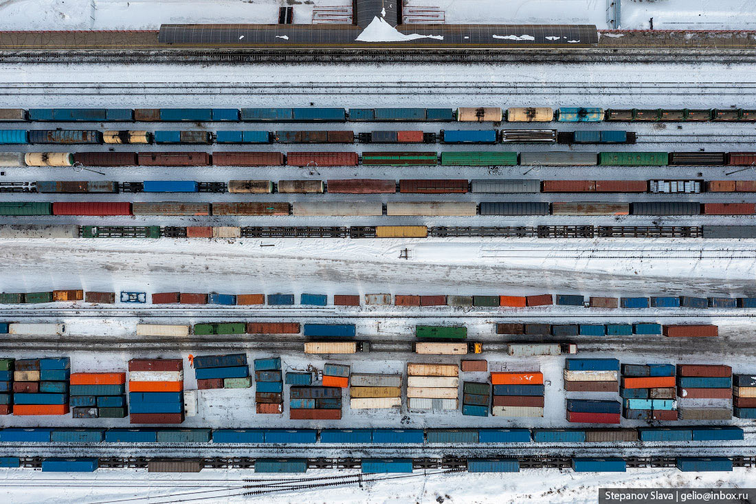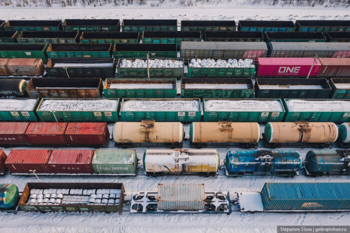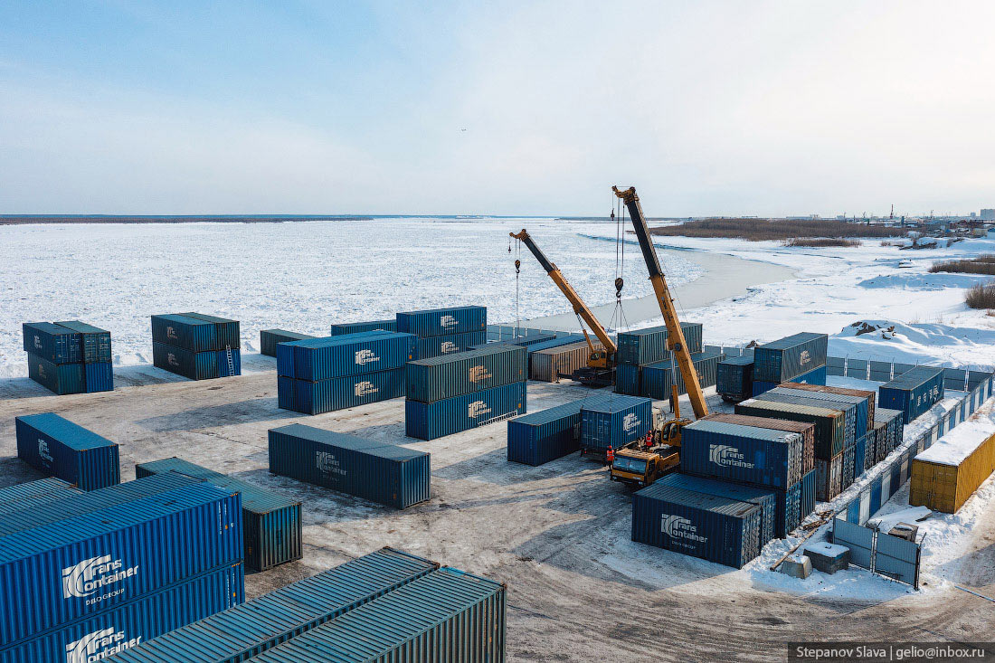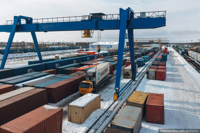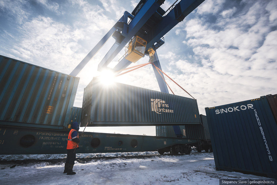 32. Контейнерный терминал разгружает железнодорожные платформы. Груз идёт как в Якутск, так и дальше в северные районы Республики Саха.