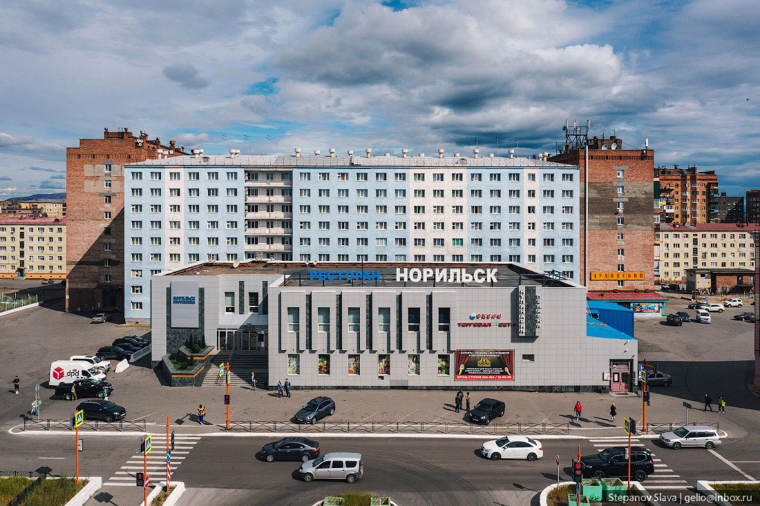61. Сразу за воротами Норильска стоит сталинка с розовым оттенком — в ней работает универмаг, пиццерия и ювелирный салон с одинаковым названием — «Норильчанка».