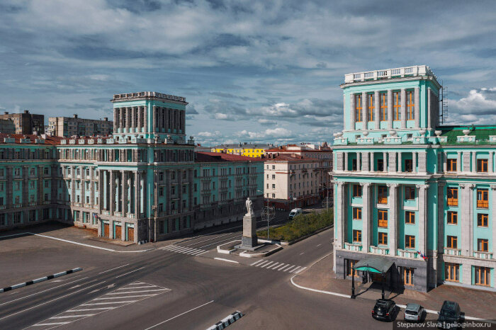 Два дома с симметричными помпезными башнями расположены на въезде в город, сразу за ними начинается Ленинский проспект — главная улица города. А всех приезжающих в Норильск встречает памятник В. И. Ленину, который установили в 1954 году. Из-за сурового северного климата скульптуру и постамент уже несколько раз реставрировали.