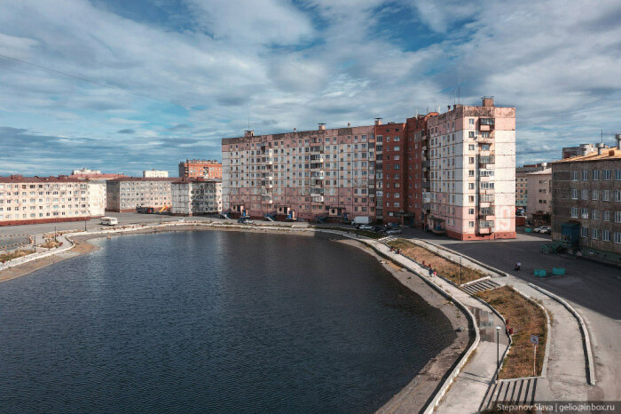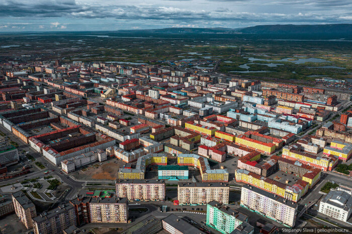 7. Кварталы в Норильске сформированы так, чтобы дома защищали дворы от ветра и метелей. Зимой здесь бывают ветры со скоростью до 40 м/с. В городе есть даже дома-кварталы, которые выстроены полным кольцом.