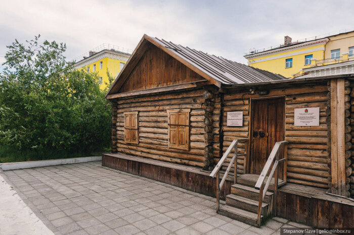 Это изба, которую построили члены экспедиции Николая Урванцева в 1921 году. Именно эта экспедиция обнаружила богатые залежи полезных ископаемых, после которых приняли решение о строительстве комбината и города. До середины 80-х дом был жилой постройкой. Сейчас Первый дом Норильска установлен на территории музейного комплекса.