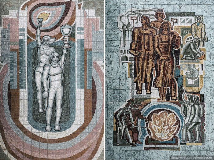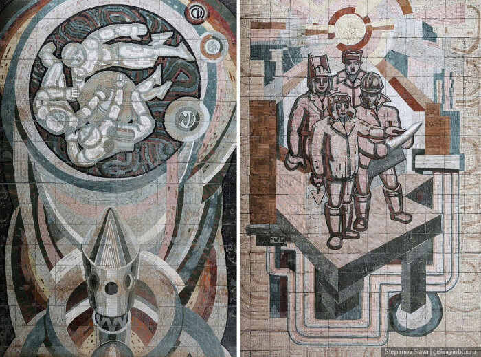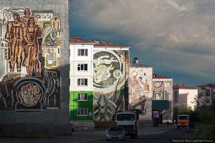 24. Мозаичные панно на улице Комсомольской сохранились с советских времён, но были сильно разрушены. Недавно мэрия при поддержке Норникеля провела восстановление мозаики.