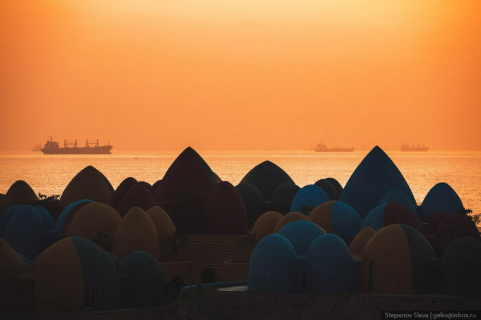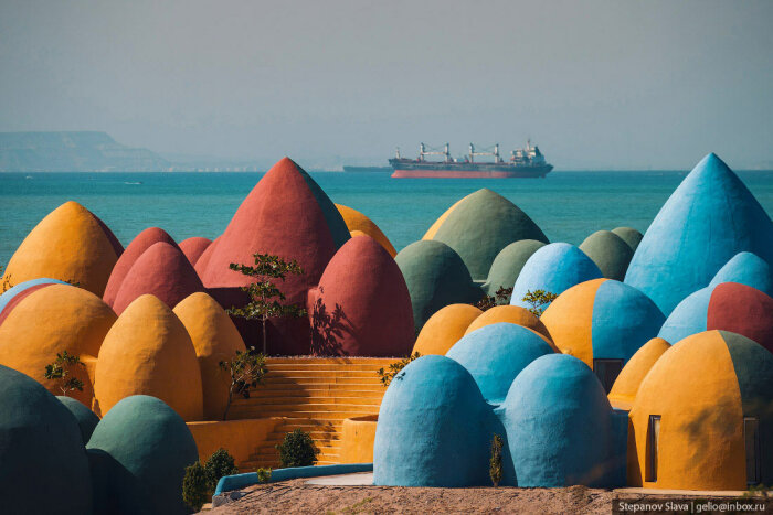 59. После появления на Ормузе современного отеля с купольными зданиями, на остров можно приехать на несколько дней — до этого приходилось останавливаться в рыбацком городке. Обычно туристы добираются сюда через Тегеран — внутренним авиарейсом до Бендер-Аббаса, из которого можно попасть на Ормуз на катере или на пароме.
