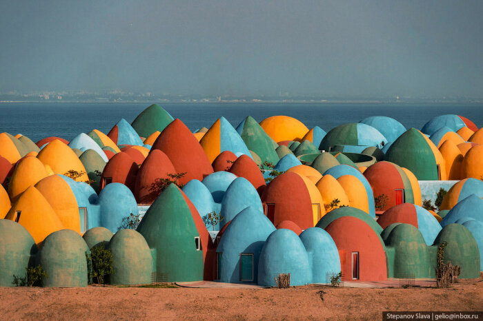 49. Купола цветные не только снаружи — стены внутри тоже выкрашены яркими красками. Для строительства использовали местные материалы — смесь земли, песка, цемента и известкового раствора укладывали в биоразлагаемые мешки. Из таких мешков и складывали будущие купола.