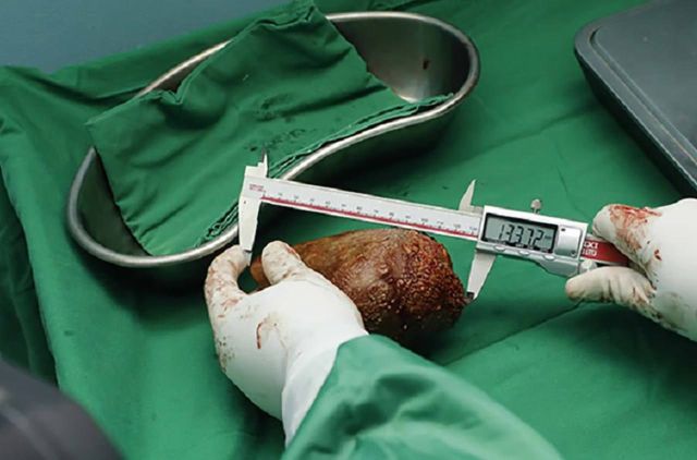 Вес камня составил 801 грамм, а его длина — 13.37 сантиметра! Таким образом, вес этой каменюки в 5 раз превысил вес среднестатистической мужской почки.