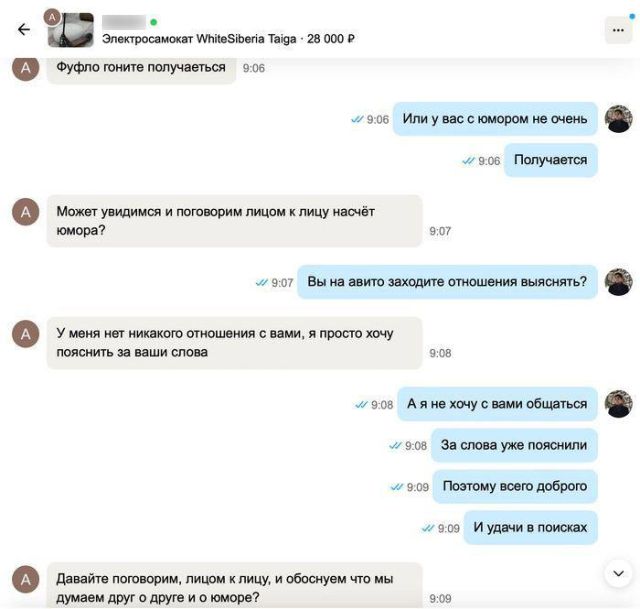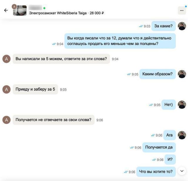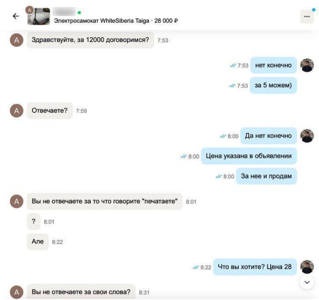 Один парень решил продать самокат. Цена - 28 тысяч рублей. Будучи человеком веселым, он с юмором ответил на наглый вопрос покупателя, который захотел купить его всего лишь за 12 тысяч. Это даже не за полцены! К сожалению, продавцу повезло нарваться на "онлайн-гопника", который шутку не понял от слова совсем. В итоге тот сразу потребовал личной встречи, чтобы продавец "ответил за базар".