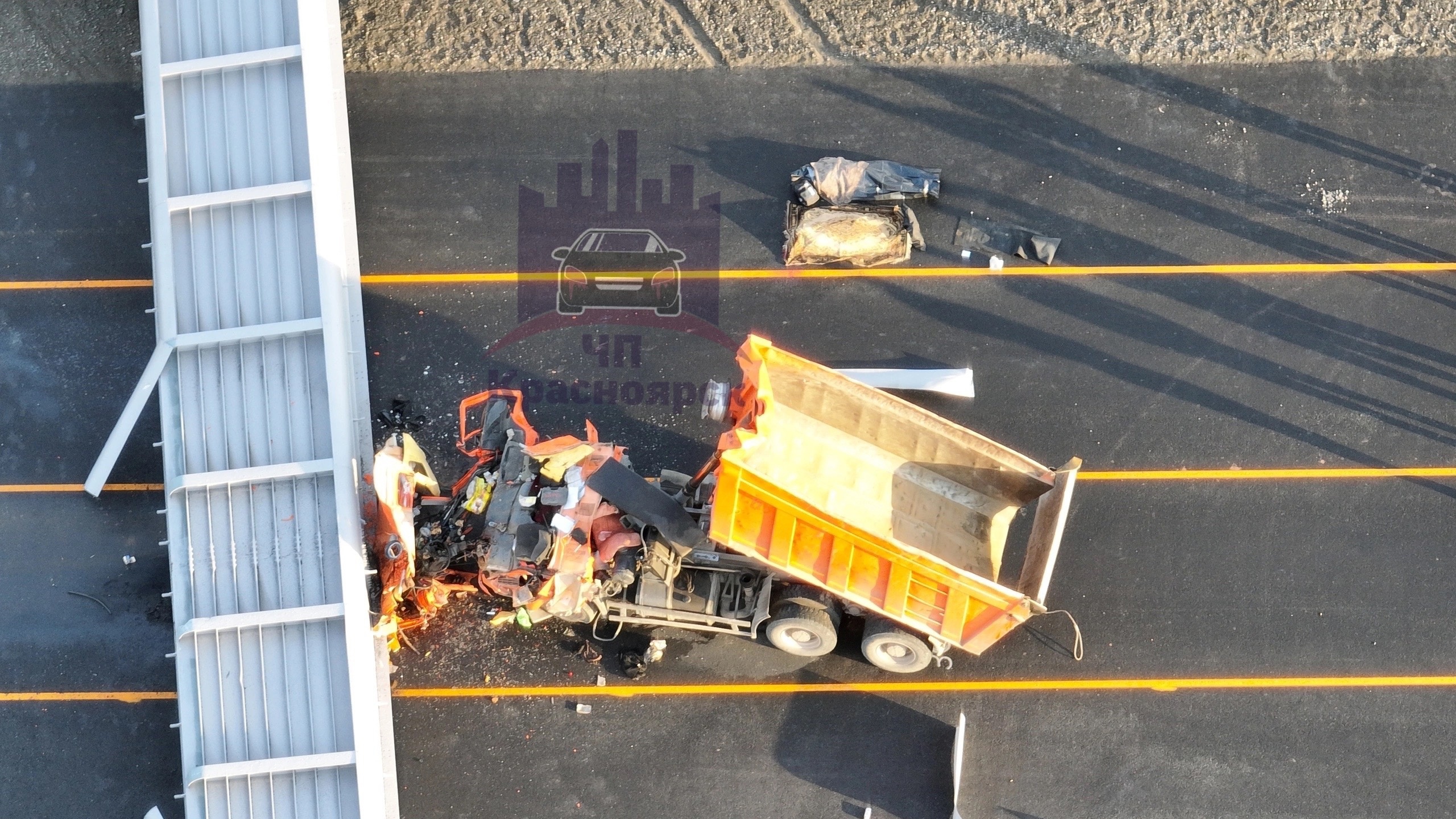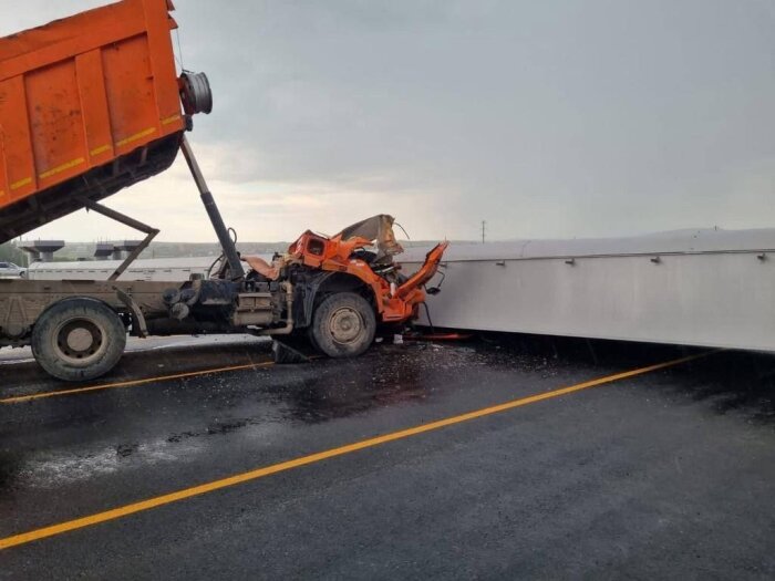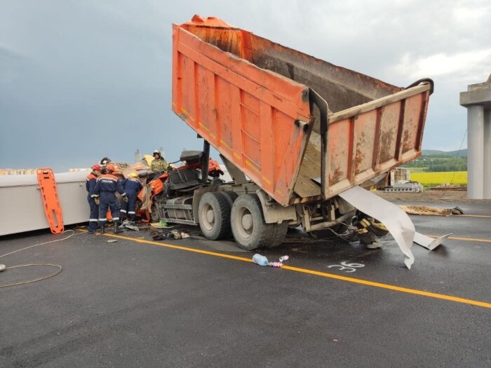К сожалению, это уже печальная классика. Водитель самосвала не заметил, что едет с поднятым кузовом, после цепляет им строящийся виадук, который по законам физики обрушивается точно на кабину.