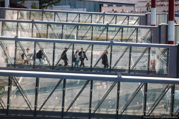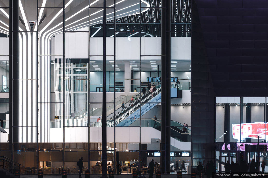 11. Стеклянные витражи закрывают фасад на всю высоту. Внешнее освещение не предусмотрено проектом специально, чтобы вечером и ночью снаружи было видно всё внутреннее освещённое пространство терминала . Это одна из задумок архитектора — максимальное проникновение интерьера в экстерьер.