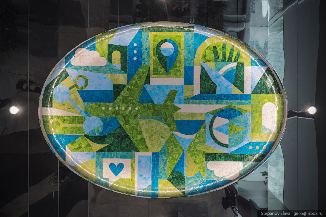 26. Потолок в бизнес-зале украшен пятью мозаичными панно. Сюжет каждого из них посвящён теме путешествий и авиации — на панно можно рассмотреть хвост самолёта, иллюминатор, ремень безопасности, фуражку пилота, диспетчерскую вышку.