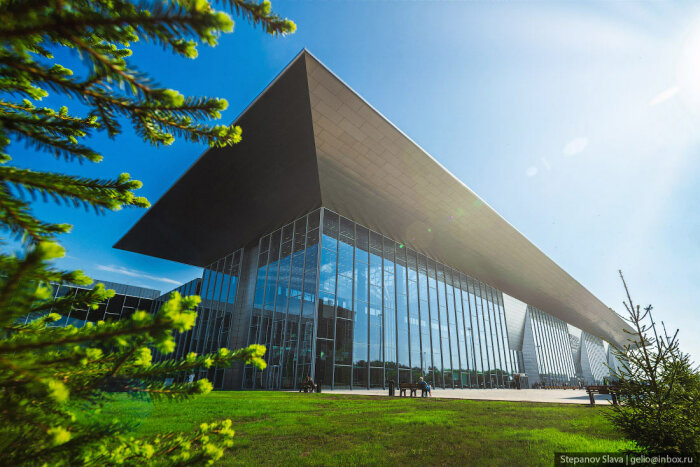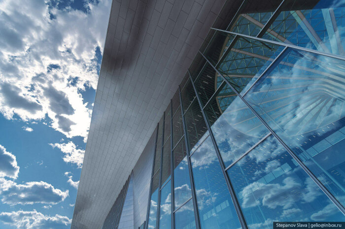 9. Фасад здания выполнен в виде единой стеклянной ленты длиной более 300 м. Строители установили витражное остекление из огромных стёкол размером 6 х 3 м.