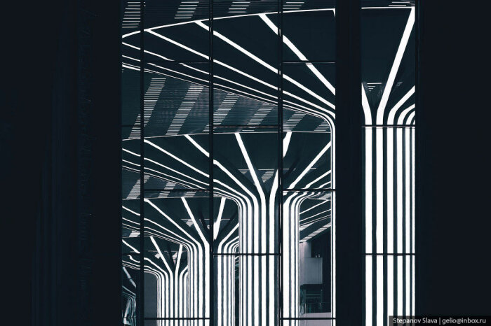 17. Колонны составлены из структурных рёбер, в которые вмонтировано светодиодное освещение. Оно делает конструкцию зрительно более лёгкой.