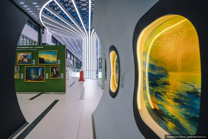 23. На втором этаже расположилась выставка Новосибирского художественного музея с уникальной концепцией картин в иллюминаторах. Зона отдыха после регистрации оформлена произведениями живописи из собрания музея. В рамках проекта создали арт-объект в виде борта самолета. Здесь использовали самые знаковые шедевры постоянной экспозиции музея — портрет Екатерины II, пейзажи Николая Рериха.