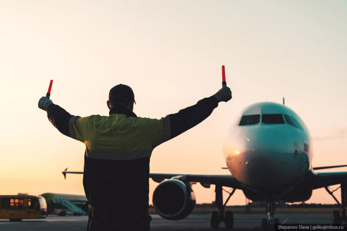 36. Специалист службы перронного обслуживания с помощью светосигнальных жезлов помогает воздушному судну зарулить на место стоянки.