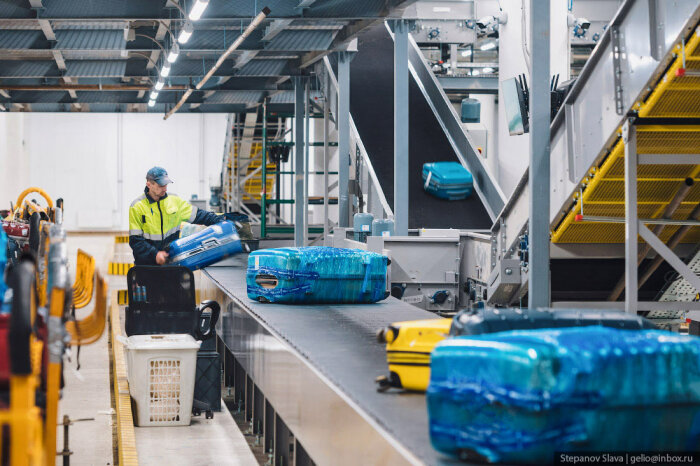 44. Сектор досмотра и сортировки багажа. В Толмачёво используется новая система работы с багажом — можно одновременно комплектовать до 20 рейсов в час.