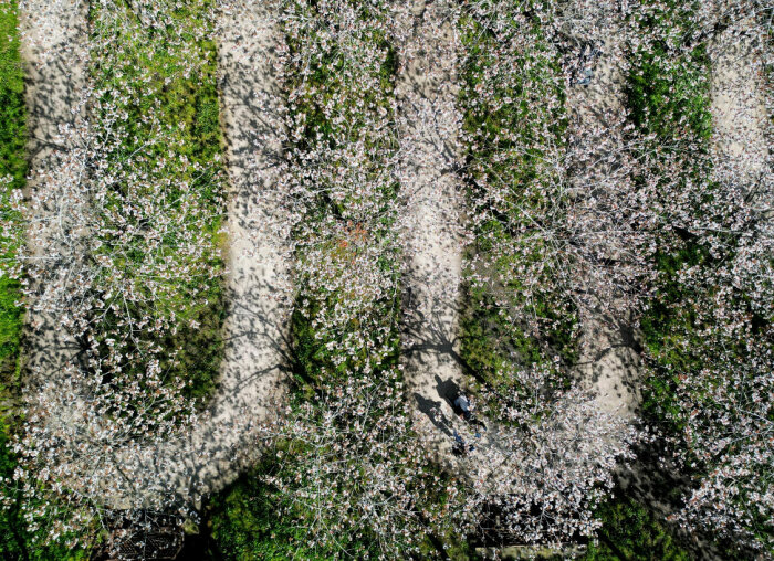 Люди гуляют по вишнёвому саду Тайхаку в садах Алнвик, Нортумберленд, Великобритания. (Фото Lee Smith):