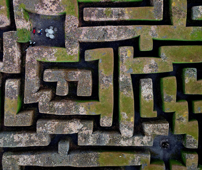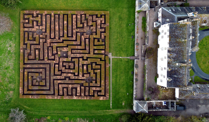 Люди гуляют по лабиринту Тракуэр, расположенному на территории дома Тракуэр, в Тракуэре, Иннерлейтен, Шотландия. (Фото Lee Smith):