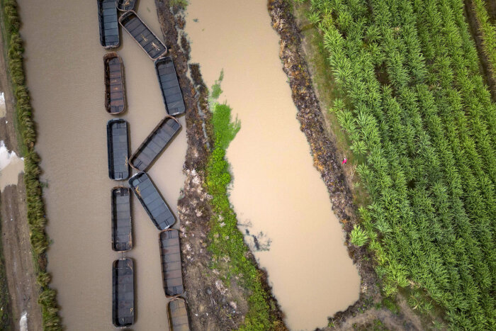 Плавучие контейнеры рядом с полями сахарного тростника. (Фото Matias Delacroix):