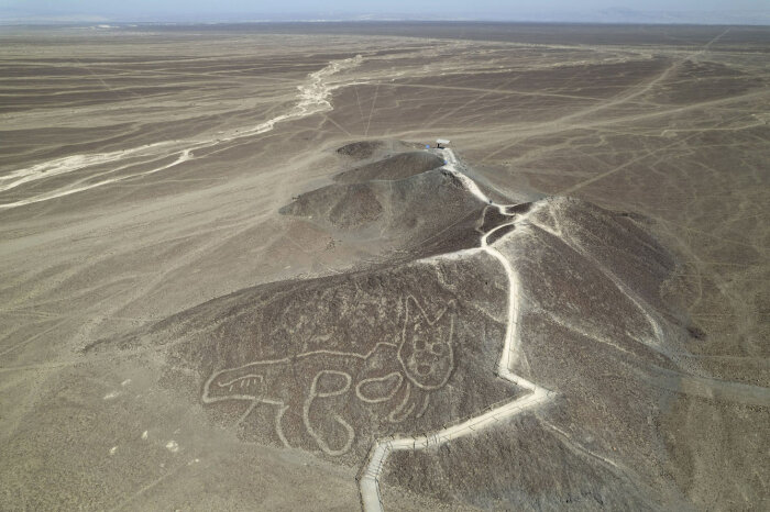 Кошачий геоглиф виден сверху в Наске, Перу. (Фото Martin Mejia):