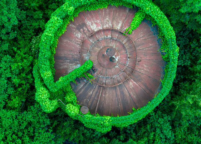 Ряд заброшенных нефтяных резервуаров на берегу реки Лиюнь в Хуайане, провинция Цзянсу, Восточный Китай. Природа уже активно начала отвоевывать своё обратно. (Фото CFOTO/Future Publishing):
