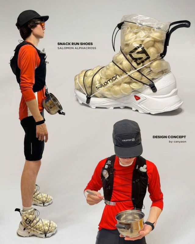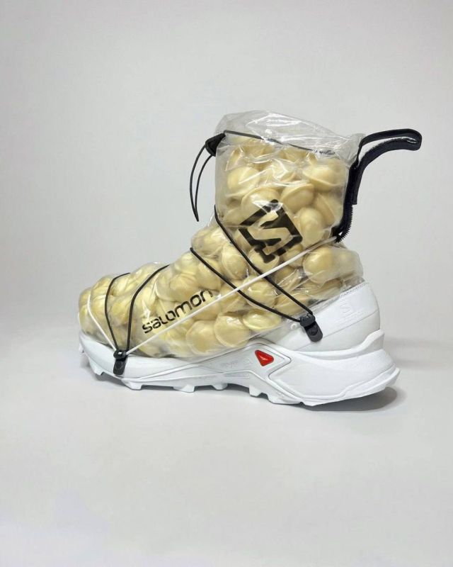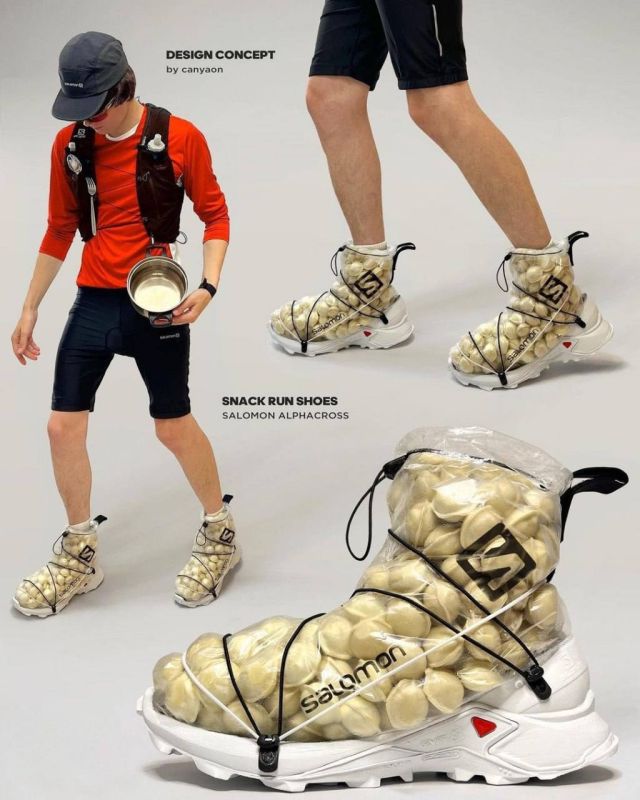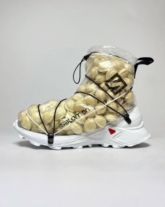 Да, это ботинки с пельменями! Необычная обувь стала интерпретацией кроссовок Salomon. Верхняя часть выполнена из пакета с пельменями, который прикреплен к подошве резинками. Кстати, на творения Осипова уже обращали внимание такие издания, как Complex, Hypebeast, Culted и даже французский GQ. Так что товарищи, модники, как насчет пельменных ботиночек на зиму?