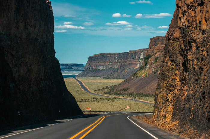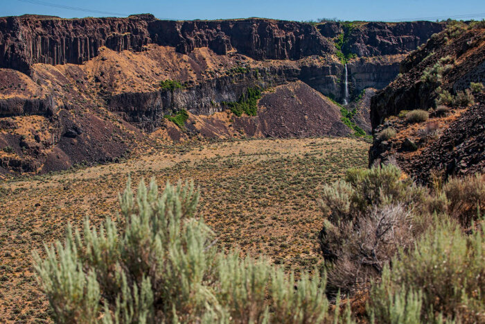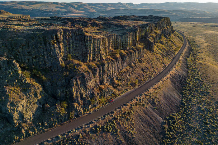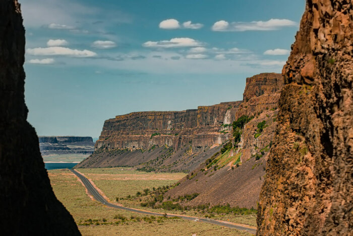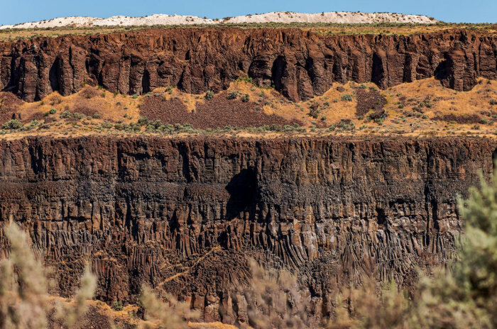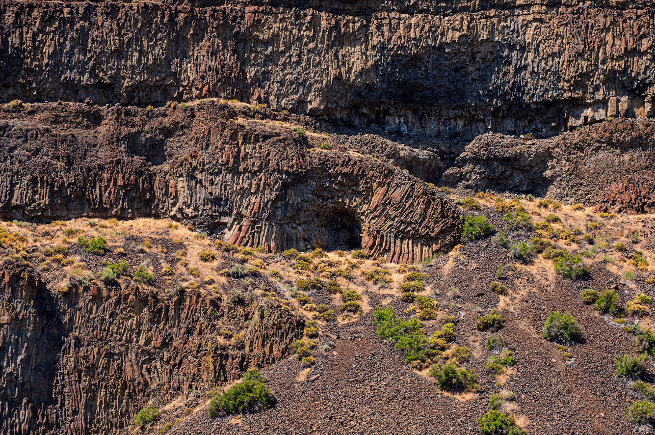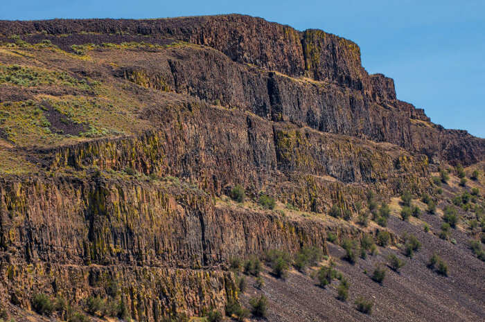Помню, как я впервые увидел кручи Колумбии когда мы гнали в Йеллоустоун избегая главного шоссе — это было удивительно! Привычные нам прибрежные горы сменялись полями. И вдруг из ниоткуда выросли крутые скаллы со стройными рядами базальтовых столбов вокруг чего-то, что с натяжкой можно было бы назвать каньоном шириной в несколько километров. Несколько минут — и снова вокруг одни поля…