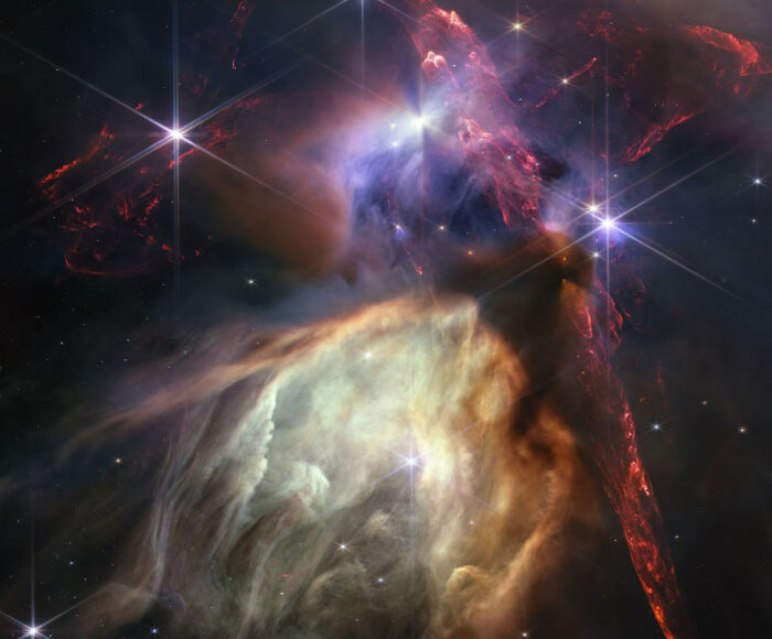 Рождение звезды. Молекулярное облако ρ Змееносца — гигантское молекулярное облако в созвездии Змееносца, представляющее собой тёмную туманность с включениями областей ионизированного водорода, получившее своё название от яркой звезды, являющейся частью этого комплекса — ρ Змееносца. Среднее расстояние до облака составляет 420 св. лет (130 пк), что делает его одной из ближайших областей звездообразования к Солнечной системе. (Фото NASA; ESA; CSA; STScI; Klaus Pontoppidan; Alyssa Pagan):